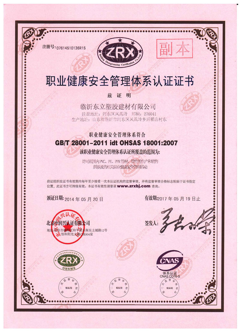 職業(yè)健康安全管理體系認(rèn)證證書